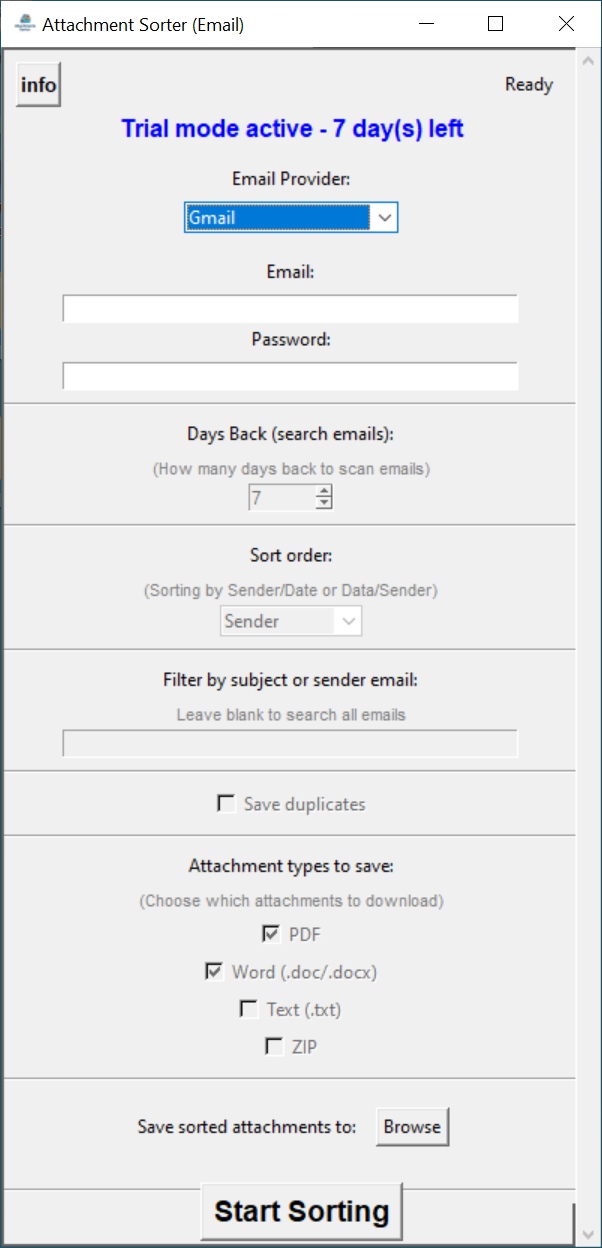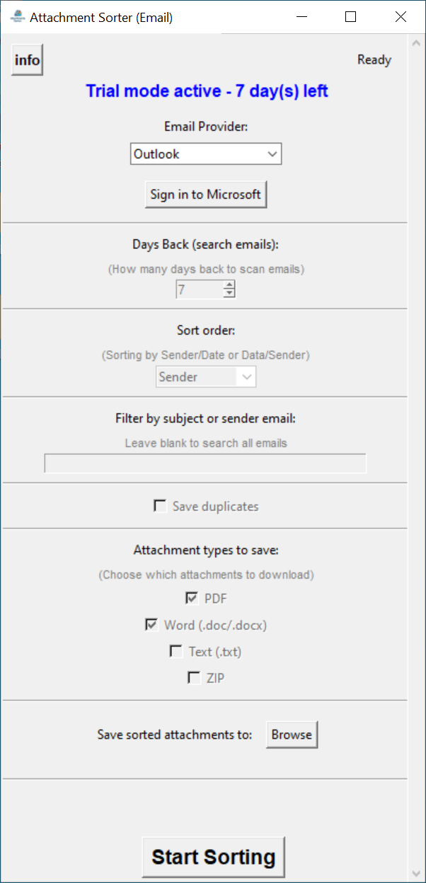 The free version includes a 7-day trial of Attachment Sorter (Email), allowing users to experience the software firsthand. While some features remain disabled during the trial, the app fully supports downloading and sorting PDFs without any limitations.